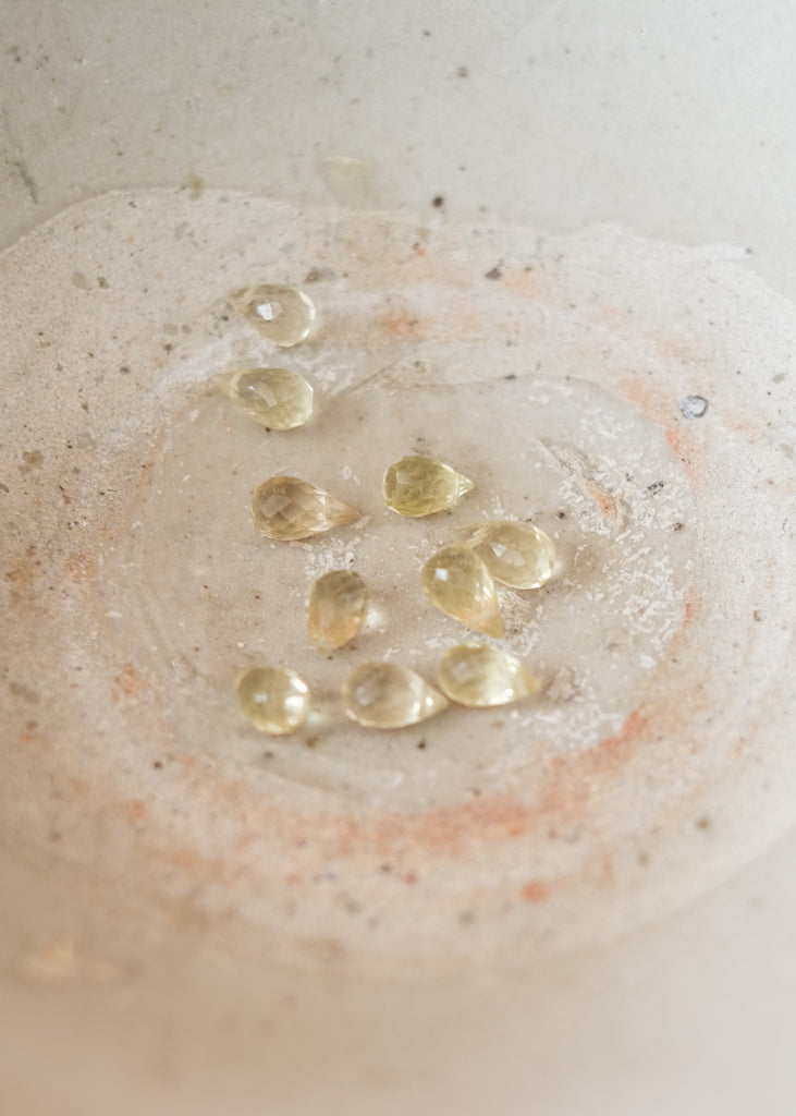 Druppelvormige lemon kwarts briolettes, facetgeslepen. Heel mooie kralen om oorbellen met te maken. Je kan enkel de ultrafijne t-pennen gebruiken om ze vast te maken aan de oorhaakjes.