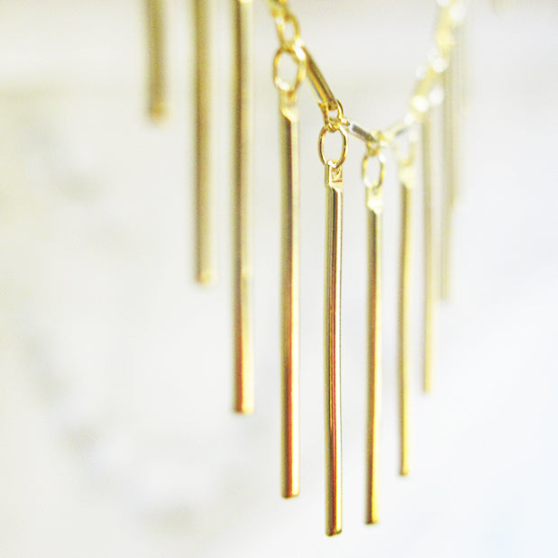 De perfecte ketting voor de feestdagen! Heel mooi om zo te dragen, als een fijn maar speciaal juweeltje. Als je het laatste stokje eraf knipt, heb je een gesloten oogje waar je een slotje of ringetje aan kan bevestigen. De 2 staafjes die je dan over hebt kan je verwerken in een bijpassend paar oorringen.