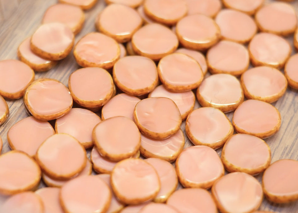 Deze collectie wordt voor Zahia gemaakt in Tsjechië. De kraal wordt machinaal geperst, de afwerking gebeurt met de hand. Als de kraal geperst is, komt er een pasta overheen. Die wordt weggeschuurd aan de boven- en onderkant. Zo krijgt de kraal een mooie gepolijste look. Aan de zijkant blijft het kleurtje zitten, dit geeft het glas-in-lood-effect. Het gekleurde boordje zorgt er ook voor dat, welke kralen je ook gebruikt uit deze collectie, alles bij elkaar past. De kralen in deze kleur kunnen lichtjes gevlamd zijn.